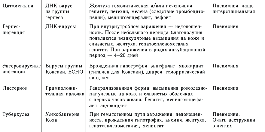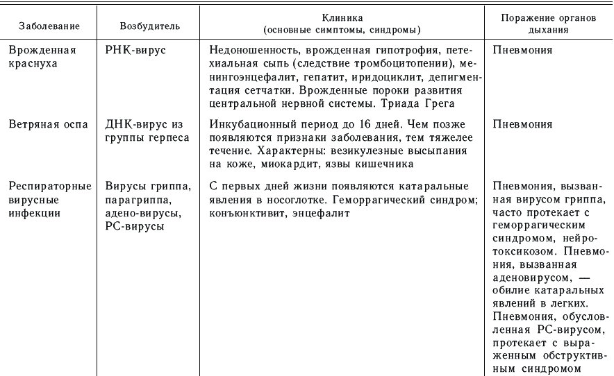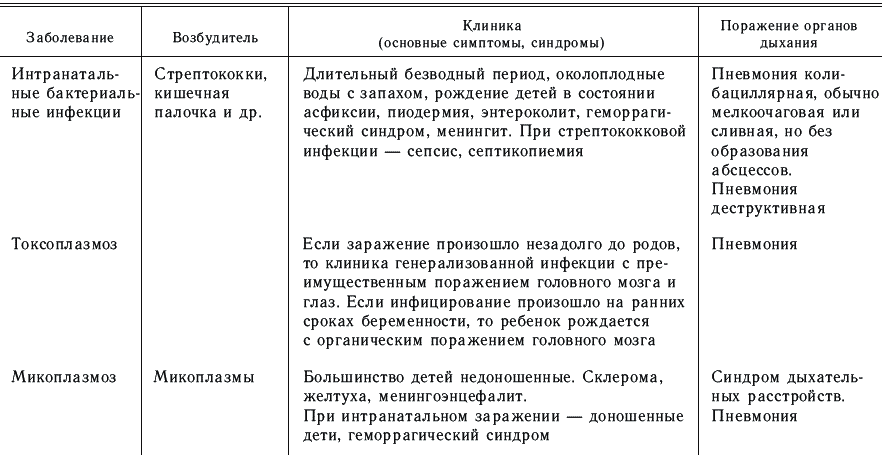 Клиника пневмоний, вызванных внутриутробной инфекцией, зависит от вида возбудителя, времени инфицирования (антенатально, интранатально) и имеет, как правило, генерализованный характер процесса, протекающего с поражением многих органов и систем.