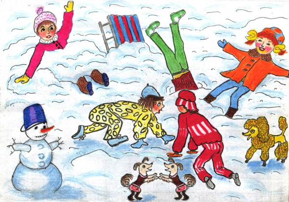 2рус). Дети обрадовались и, как горошины из подсохших стручков, высыпали из домов во двор. И пошла тут снежная потеха: кто в снежки играет, кто катается на санках и лыжах, кто лепит снеговика.