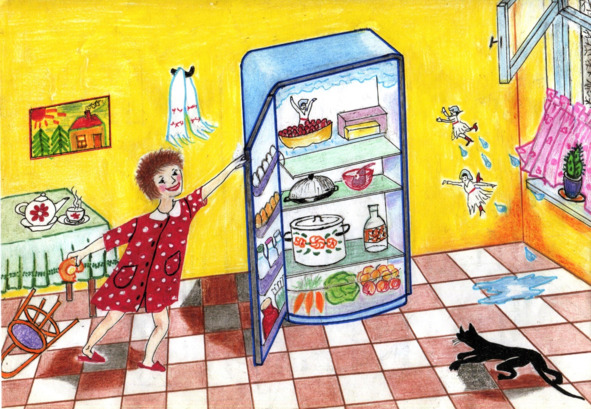 4eng). Soon Tata fell asleep and saw in her nightmare a huge three-headed and multiarmed monster-illness, he tried to steal Tata from her mother. However, everybody sent him away. Tata’s father shot at him with tomatoes using Vovka’s Y-shaped stick. Grandmother hit the monster with the broom. And the doctor pricked the monster-illness with a large syringe therefore the illness disappeared.