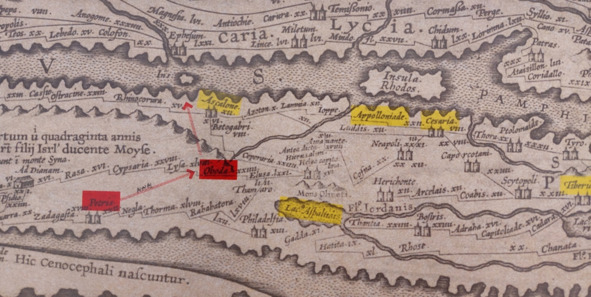 Со времён Великого Вавилона скифы – самаритяне добывали медь на Ближнем Востоке и отправляли металл на остров Кипр. Этот фрагмент карты из частной коллекции является частью экспозиции национального музея города Авдат. Здесь остров назван Rhodos, ведь Кипр- значит медный остров, от Cuprum – медь. Торгово-промышленный путь поставки меди мы и видим на карте. Для наглядности карта привязана к современной местности.