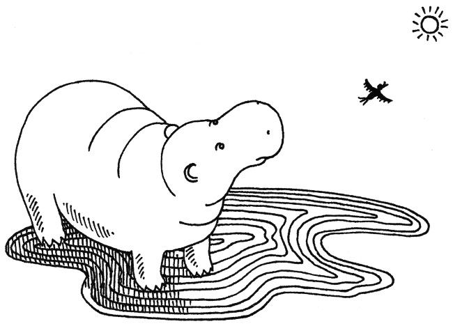 Помимо Крокодила, одиночество Бегемота скрашивало лишь одно существо: маленькая птичка, у которой, конечно, было имя, но звери его давно забыли и называли ее просто Пиу-пиу – так звучала песенка, которую она распевала с восхода солнца до позднего вечера. Птичка Пиу-пиу была очень полезным другом. Каждое утро она отыскивала Бегемота, который в это время обычно принимал грязевую ванну, после короткого приветствия усаживалась ему прямо на голову и начинала выклевывать из складок его толстой шкуры притаившихся там паразитов. А надо вам сказать, личинки африканского овода способны доставить массу неприятностей даже такому толстокожему зверю! Поэтому Бегемот всегда бывал ей ужасно благодарен и радостно подставлял под ее клюв то шею, то загривок, то бока. Потом птичка, туго набив животик, весело чирикала ему «пиу-пиу» на прощанье и улетала по своим делам.