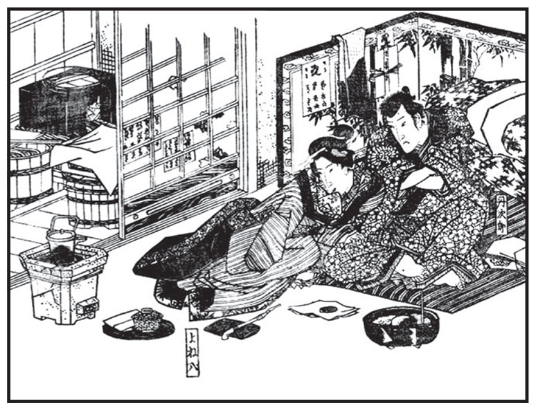 Ёнэхати. По правде говоря, с утра я пошла помолиться в храм Мёкэн-сама. И вот удивительная встреча. Вы – и в таком месте! Мне и во сне бы не привиделось искать вас здесь, если бы не одна девушка, новенькая, ее взяли к нам недавно. Наши, как водится, спросили, откуда она родом, и оказалось, что из Хондзё. От нечего делать завели разговор, и она рассказала обо всех своих соседях. Один из них чем-то напомнил мне вас… А может, это только показалось? На ночь я положила ее спать у себя и расспросила как следует. Она сказала, что в доме вашем есть и хозяйка, красивая да ладная, и я было усомнилась, однако стала еще дотошнее задавать вопросы. Оказалось, что хозяйка вроде бы старше хозяина и обыкновенно дома ее не бывает. Чем больше я слушала, тем больше убеждалась, что речь может идти о вас. Но все же я не могла быть уверена до конца и наказала девушке помалкивать о моих расспросах. Я надеялась во всем удостовериться, когда пойду на богомолье. Можете себе представить, с каким нетерпением я ждала сегодняшнего дня – пятнадцатого числа. И вот наконец я здесь. Ведь говорят же люди: если день-деньской молиться об одном… Не иначе как сам бог Мёкэн привел меня к вашему дому. Но как я ни рада, мне не дает покоя слух, что вы женаты. Где сейчас ваша жена?