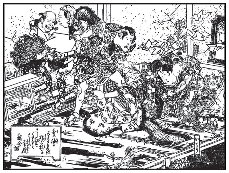 Шестеро спасителей О-Тё. Ишь, недотепы! Мы – жители восточной столицы[21], и с нами шутки плохи! Подонки сбежали без следа. Жалкие трусы! Нечестивцы! Да они не знают, с кем имеют дело! Пусть же хорошенько прочистят уши и усвоят себе: мы братья почтенной госпожи O-Ёси из Коумэ.
