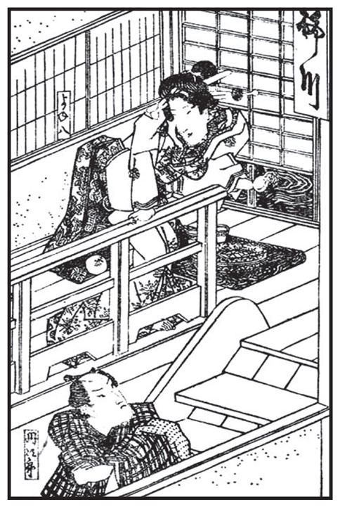 Девять лет святой Дарума… – По преданию, основатель секты Дзэн святой Бодхидхарма (яп. Дарума) девять лет провел в медитации, сидя лицом к стене, и достиг озарения. Срок контракта женщин в увеселительных заведениях равнялся обычно десяти годам. Приобретаемый за стенами веселого квартала житейский опыт нередко сравнивали с мудростью святого. Изречение встречается на многих предметах быта эпохи Эдо: веерах, портсигарах. Словом дарума иногда называли проституток.