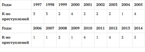 На практике, по указанным ранее причинам, оно встречается нечасто, за 1997–2014 гг. всего зарегистрировано 44 преступления (см. табл. 1).
