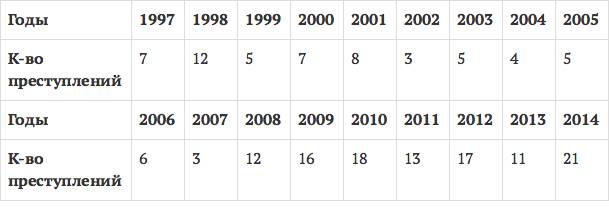 В период с 1997 по 2014 г. поставлено на учет 173 рассматриваемых преступления, причем наибольшее число таких деяний совершено в 2014 г., меньше всего – в 2002 и 2007 гг. (см. табл. 2).