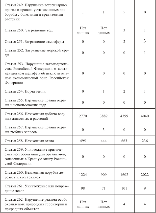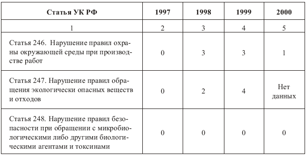 Приведенная ниже таблица свидетельствует о явной дефектности уголовно-правовых норм, которая, несомненно, негативно влияет на эффективность деятельности, направленной на охрану окружающей среды.