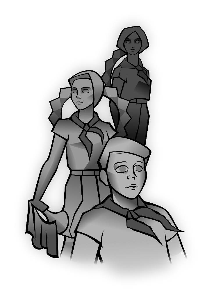 Скульптуры уже давно там стоят. Те две девушки и паренёк. Работники лагеря постоянно раскрашивают их, но фигуры пионервожатых почему-то каждый раз очень быстро ветшают. И зрачки их ещё…Если вы по каким-то причинам останетесь здесь в ночь после конца последней смены, то увидите, как их зрачки меняют положение и глаза начинают смотреть в другую сторону».