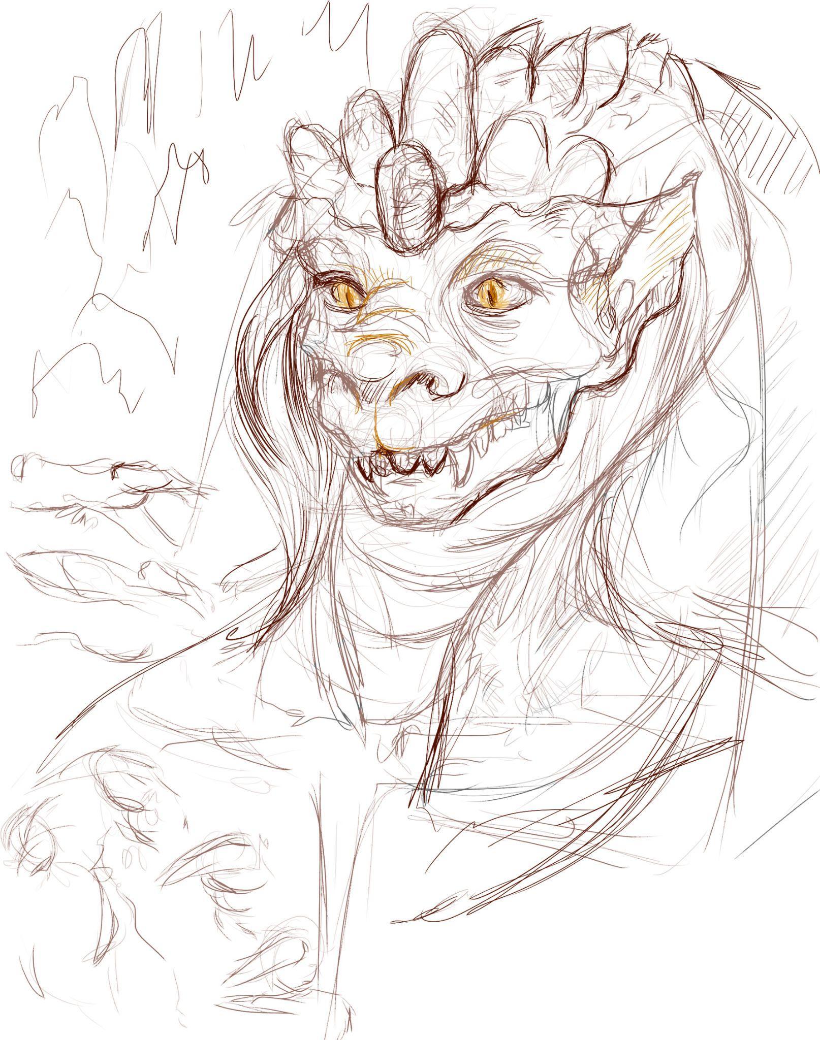 Высокие сапоги, сшитые точно по ноге, бриджи, обтягивающие бёдра. На чешуйках, покрывающих руки неожиданно мелькнул первый луч солнца. Подняла взгляд выше, и тут же отпрянула испуганно пискнув. Невообразимая помесь лица человеческого с мордой ящерицы моргнула золотыми глазищами и облизнулась.