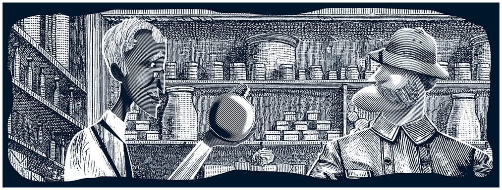 Владелец лавки «Вся‐кая всячина» стоял за прилавком. Это был высокий седой мужчина лет семидесяти. В руках у него была фляга ценой во флорин, много два, но он уговаривал покупателя заплатить вдесятеро больше.