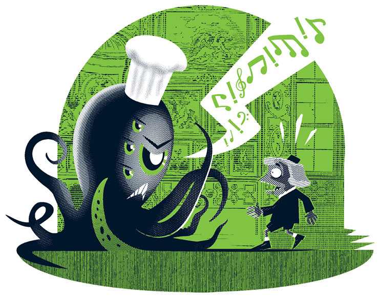 Распахнулась другая дверь, и в кухню ввалилось огромное, все в щупальцах, существо – оно тащило целую груду кастрюль и сковородок. С виду оно смахивало на гигантского осьминога, вот только у него было слишком много глаз и на шишкастой голове – колпак повара. Воррин в ужасе попятился. Руперт упоминал, что Уоррен держит в отеле какое-то животное, но чтоб такое!
