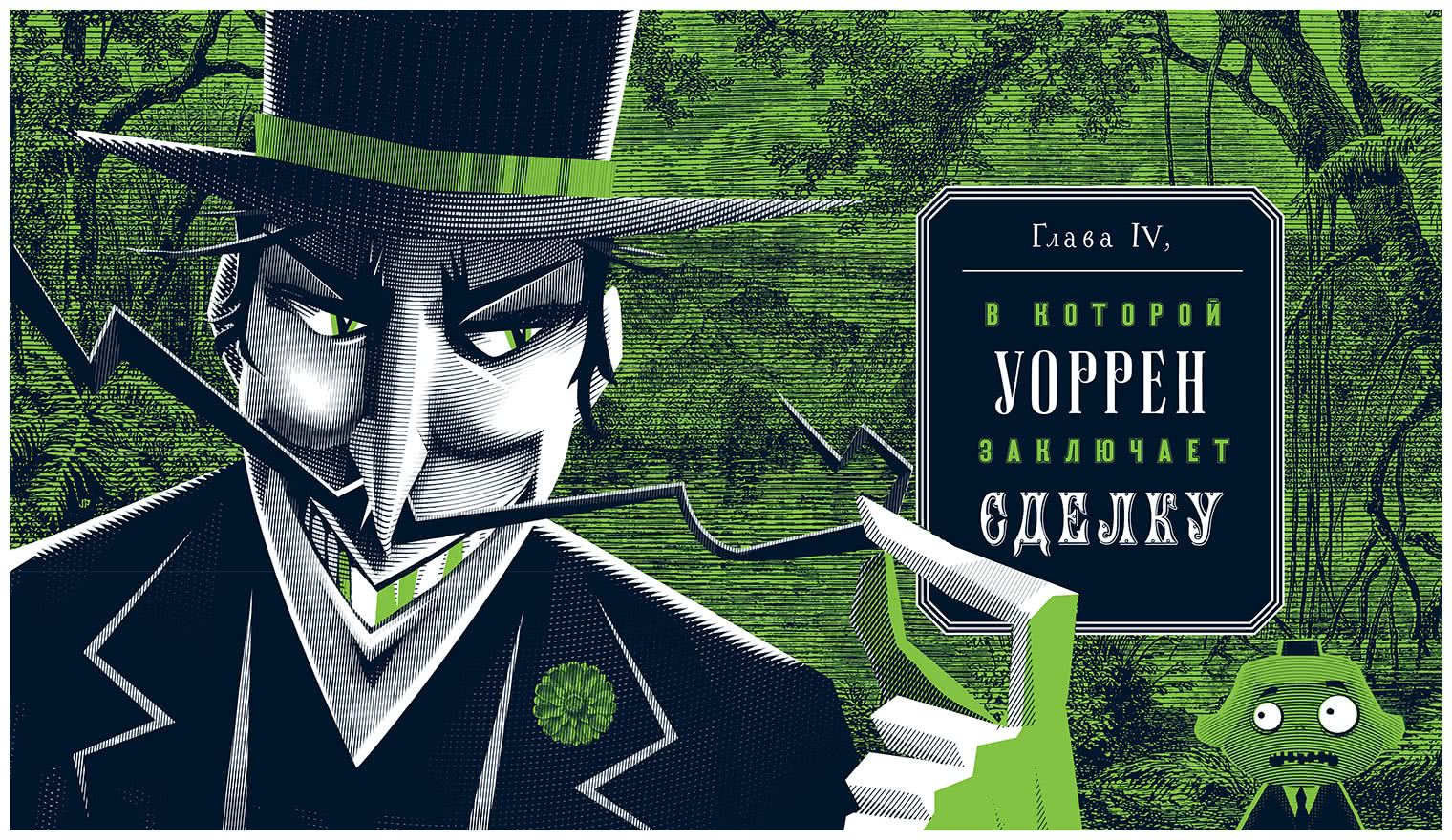 Возле кассы Уоррен заметил кувшин со свитками пожелтевшей бумаги: это же карты! Он порылся и отыскал Мальвудский лес. Расстелив карту на прилавке, Уоррен изучил местность. Маленькие зеленые треугольники обозначали леса, это он знал. Жирная волнистая линия – по всей видимости, широкая река, а пунктир – дорога. Дорога, петляя туда и сюда, проходила сквозь самую чащу, покуда не упиралась в море. И там, на границе Мальвуда, у самого моря черными чернилами был обведен неровный круг. Даже без надписи Уоррен сообразил бы: это и есть внушающий ужас Черный Кратер. Нужно перехватить отель прежде, чем тот доберется до кратера! Но как?
