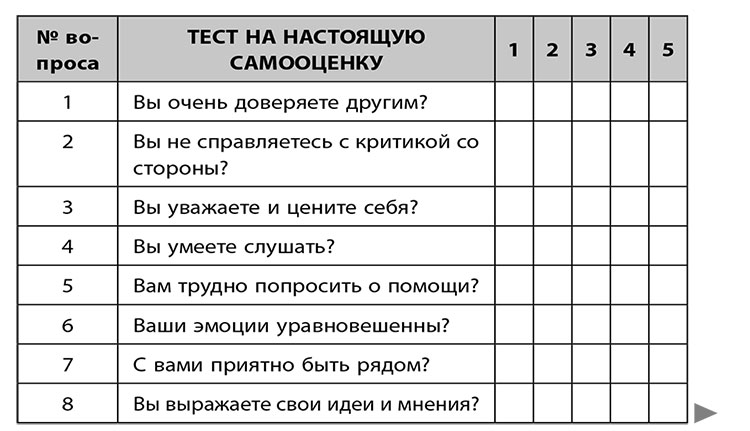 Размышляя о настоящей самооценкеЧтобы узнать, настоящая ли у вас самооценка, выполните следующий тест. Когда захотите, без давления и излишней требовательности к себе, без чувства вины или стремления к совершенству (помните, что все это только способствует заниженной самооценке). Отметьте цифры, которые описывают вас в данном случае.