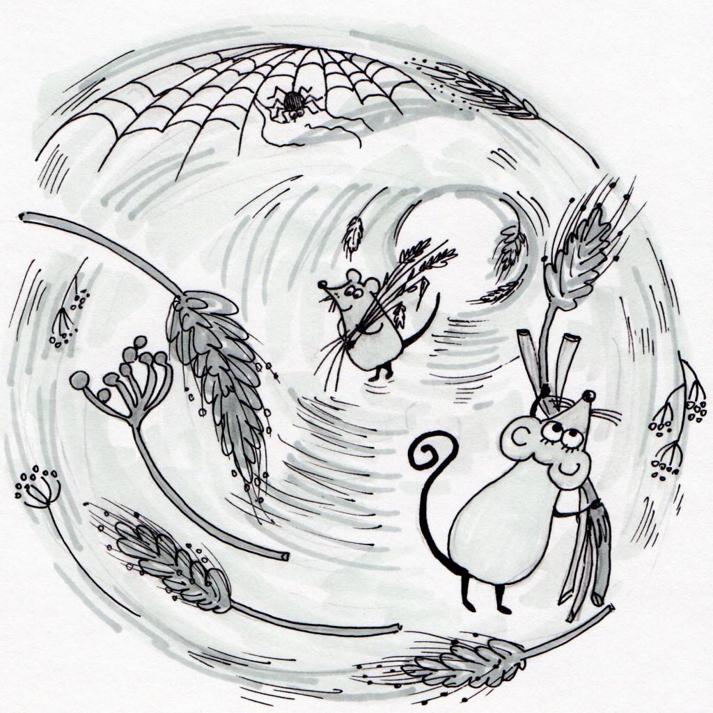 «Какой же у меня умный брат!» – подумал про себя Микс и стал таскать солому к норе. Там они ее ровно сложили и связали. Работали они целый день, и к вечеру уже сделали много соломенных тюков и внесли их в норку.