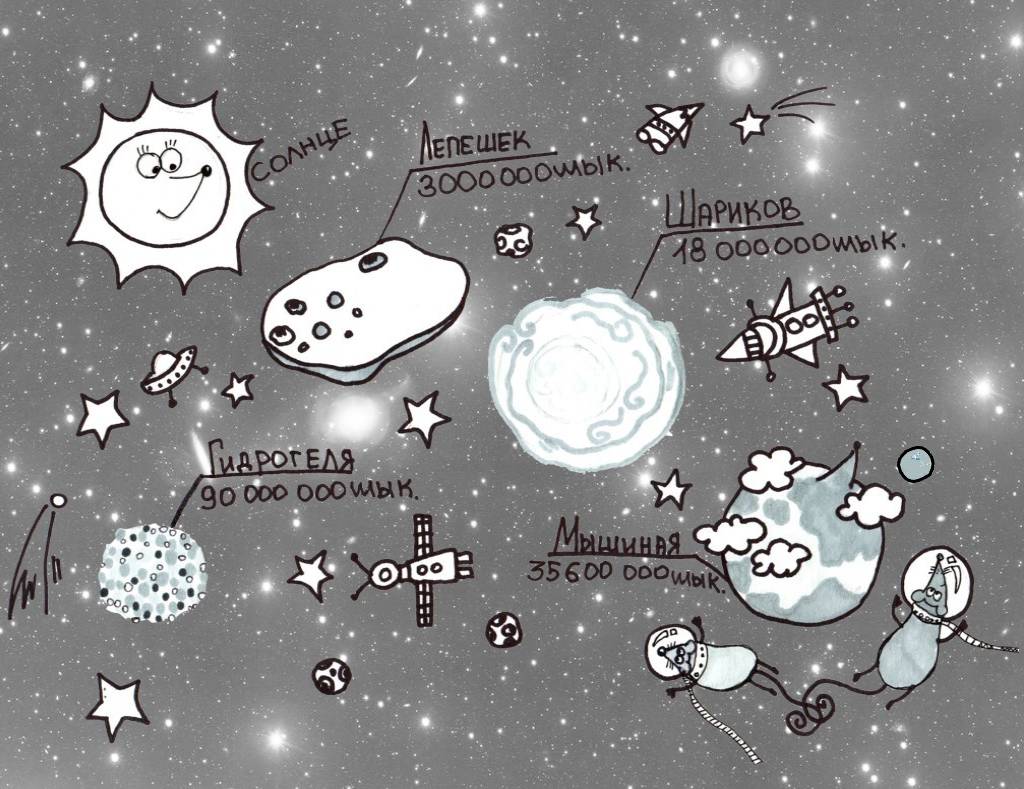 Первая – планета Лепешек, 3 000 000 шымокилометров (кратко шык.) от Пительгейзы. Она плоская, как лепешка. Какое еще название ей бы подошло? Тем более на ней живут круглые существа, которые все время пекут лепешки и едят их и на завтрак, и на обед, и на ужин.