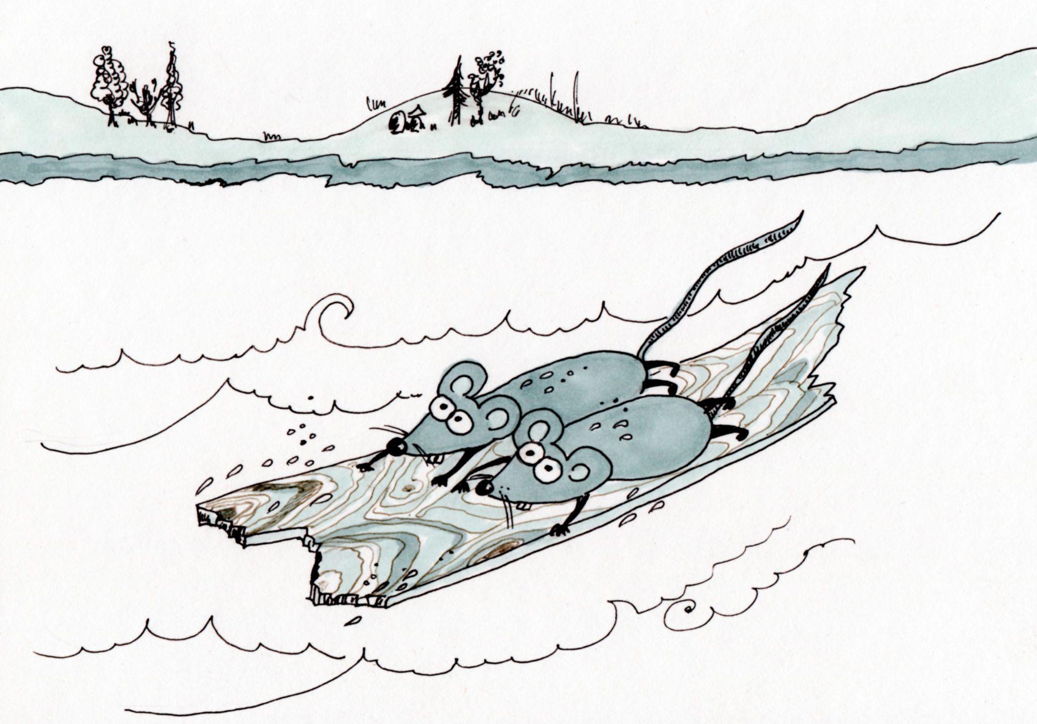 Микс и Макс вцепились коготками в доску, вжались в нее. Их хвосты дрожали непонятно от чего больше: то ли от страха, то ли от мокрого холода. Но им повезло, в реку прямо по курсу упало дерево. Доска врезалась в него. Шымята вскарабкались по веткам на ствол и выбрались на берег.