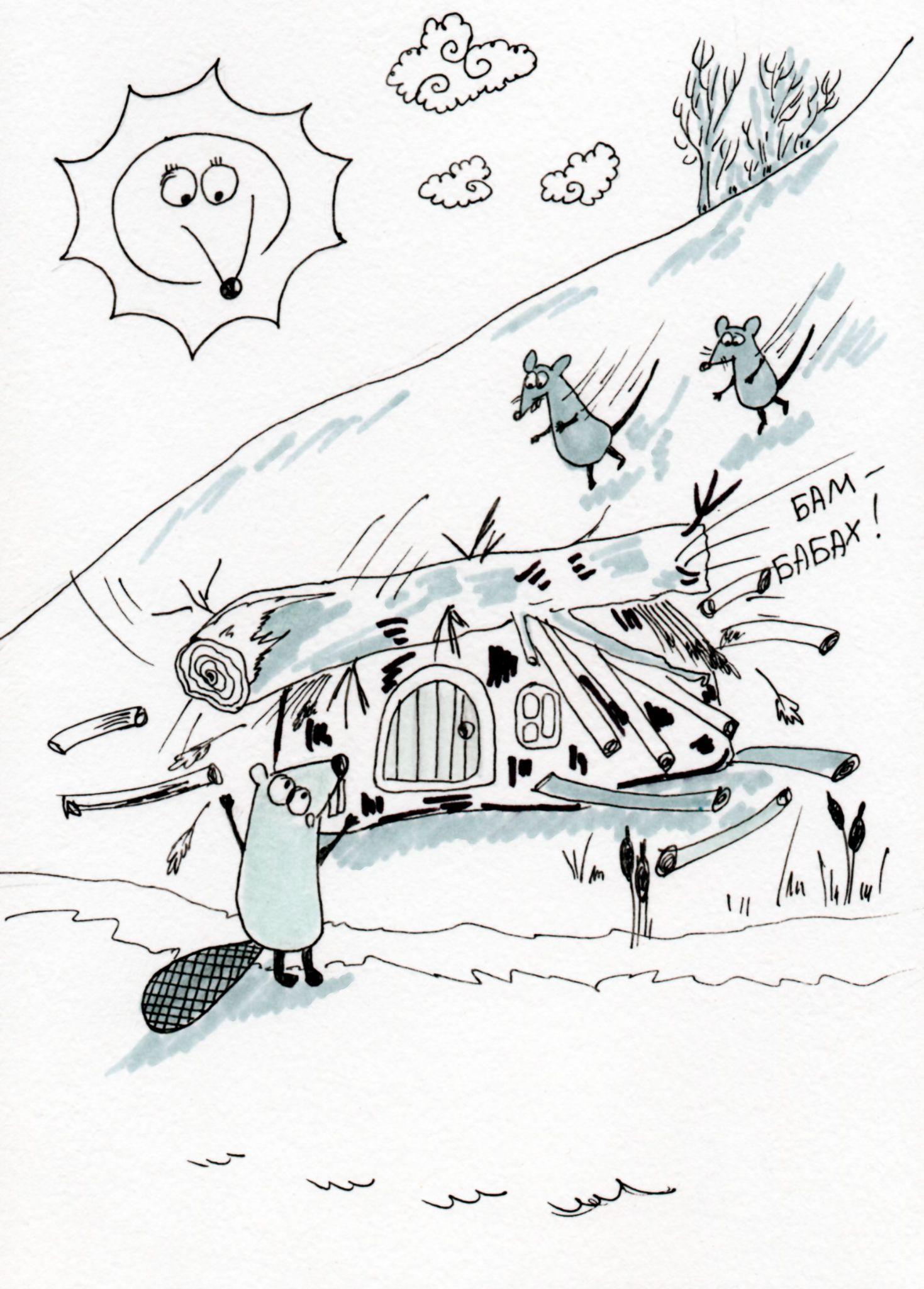 И он своими острыми зубами, – а это самый лучший грызопилильный инструмент, который только придумала природа, – за несколько минут управился с ветками. Втроем они скинули бревно с хатки бобра. После чего шымята помогли поправить дом.