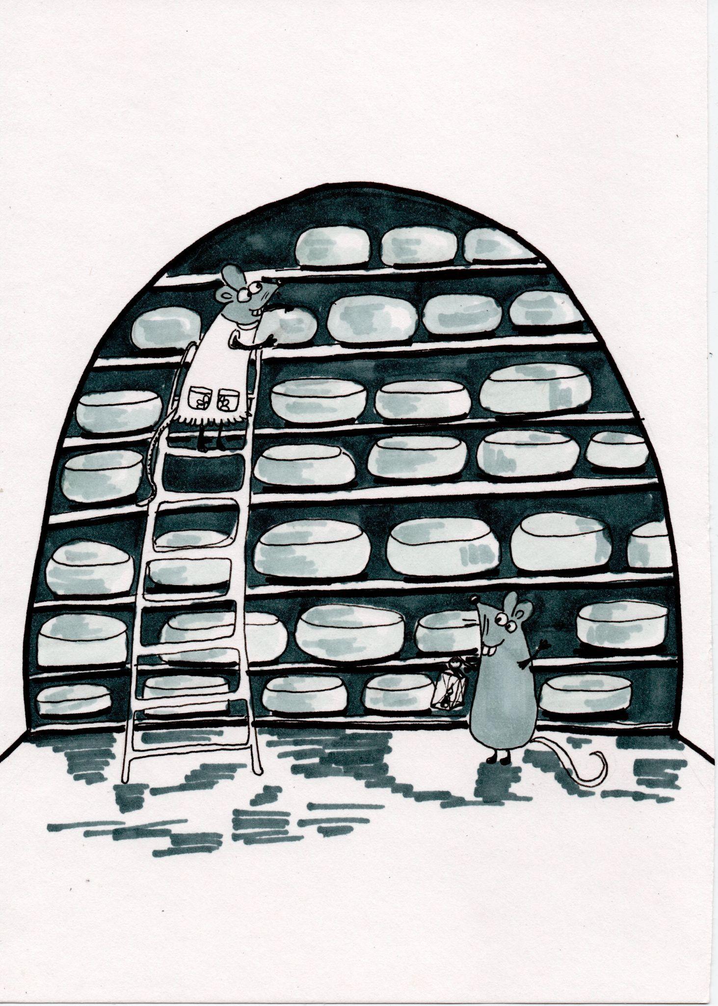 Мими отодвинула таз, за ним был узкий проход размером с головку сыра, но для шустрой шымки пролезть было нормально. Тоннель был не очень длинный, потом он расширился и перед Максом открылась огромная длинная стена из сыра. Головки писыра были плотно уложены друг к другу. К верхней полке была приставлена лестница.