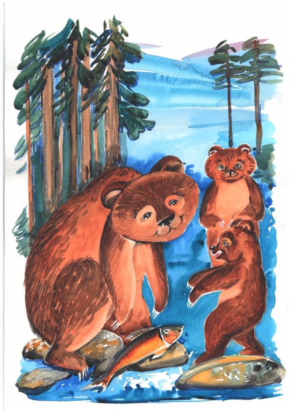 Матвей и его сестра Агата родились в тайге. На многие километры тянулись ели, сосны, пихты. Мама-медведица была строга, ругала за шалости и непослушание. А старший брат Потап следил за медвежатами внимательно, помогал маме. Любили медведи ягодами лакомиться, мёдом и рыбой. Потап – почти взрослый медведь, ловля рыбы – его любимое занятие. Замрёт на камне, не шелохнётся, рыба подплывёт поближе, тут он её лапой оглушит, ловко подхватит и на берег выбросит. Бьётся рыба о камни и песок, не может без воды дышать. Тут для Агаты и Матвея – развлечение и первые навыки охоты.