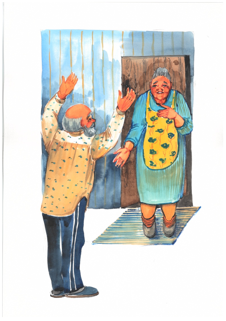 Обрадовалась бабка, перестала плакать и начала деду вещи собирать. Маленький чемоданчик получился. Даёт его деду в руки, открывает дверь на улицу и говорит: «До свидания, дед!». И пришлось деду уходить. Смотрит он, а на улице дождь. «Куда, – говорит дед, – я без зонта пойду?» Пришлось бабке деду зонт дать. И галоши новые, и плащ. «И собаку, – говорит, – свою любимую сторожевую заберу».