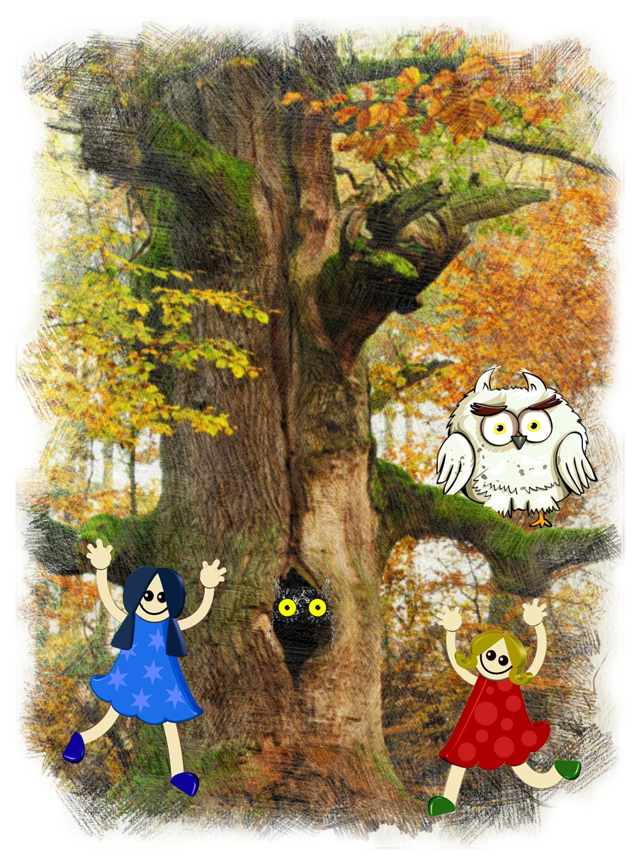 Подруги побежали в ту сторону, куда указывала стрелка на странной вывеске. Попав в подворотню, они подошли к дому, где рос развесистый дуб, и остановились у дупла в получеловеческий рост. На ветке дерева, нацелив жёлтые глаза в незваных гостей, восседала огромная лупатая сова с бело-кремовым опереньем. При встрече с девочками птица напыжилась. В ответ они, по образу и подобию, тоже вылупились на неё, а затем, постояв минуту в раздумьях, громко дуплетом выпалили: