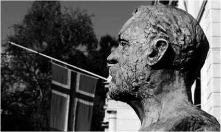 Бюст Альфреда Нобеля на фасаде Института его имени в Осло