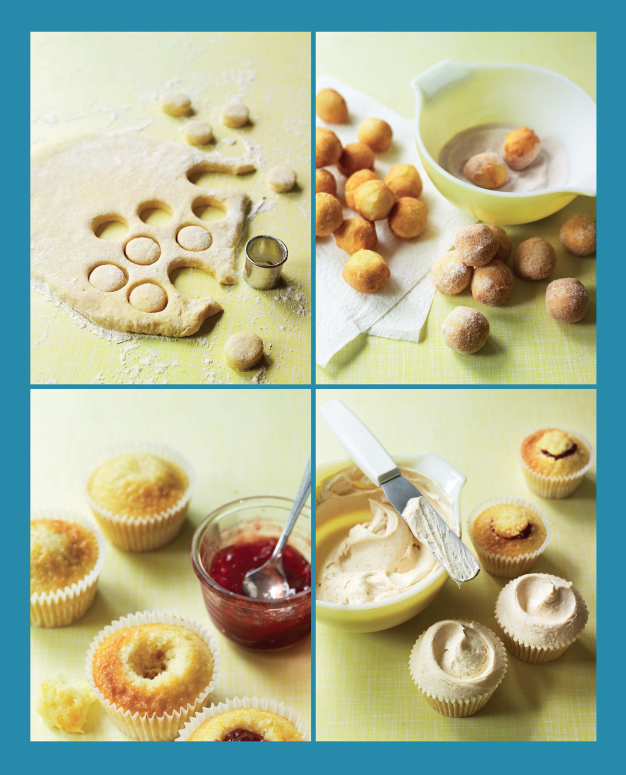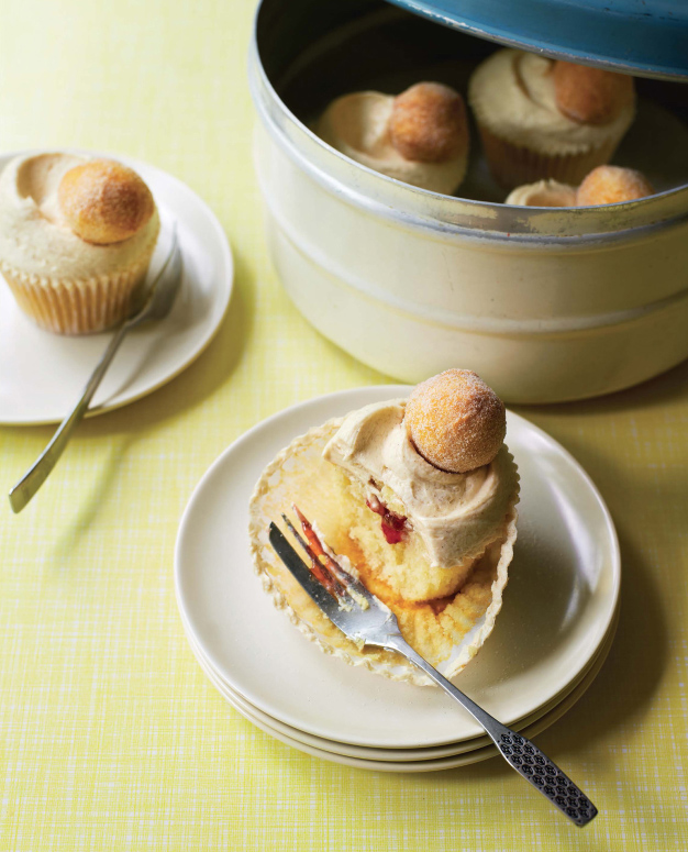 14. Spoon generous amounts of the frosting onto each cupcake, then gently smooth over with a palette knife, making a swirl at the top if you wish. Top each cupcake with a small doughnut ball.