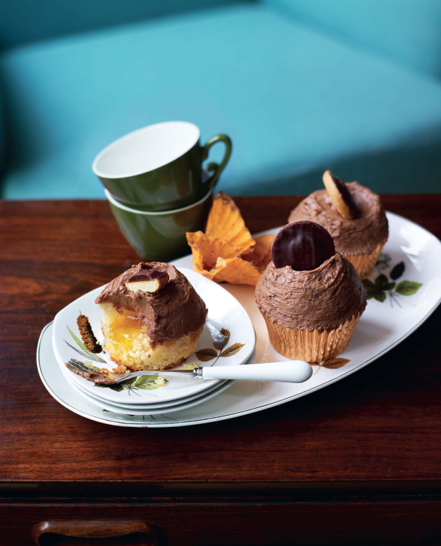 9. Spoon a generous amount of the frosting onto each cupcake, then gently smooth over with a palette knife, making a swirl at the top if you wish. Top each cupcake with a mini Jaffa Cake.