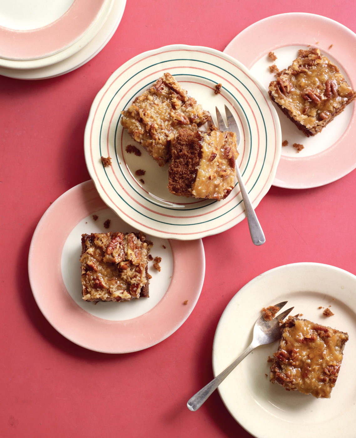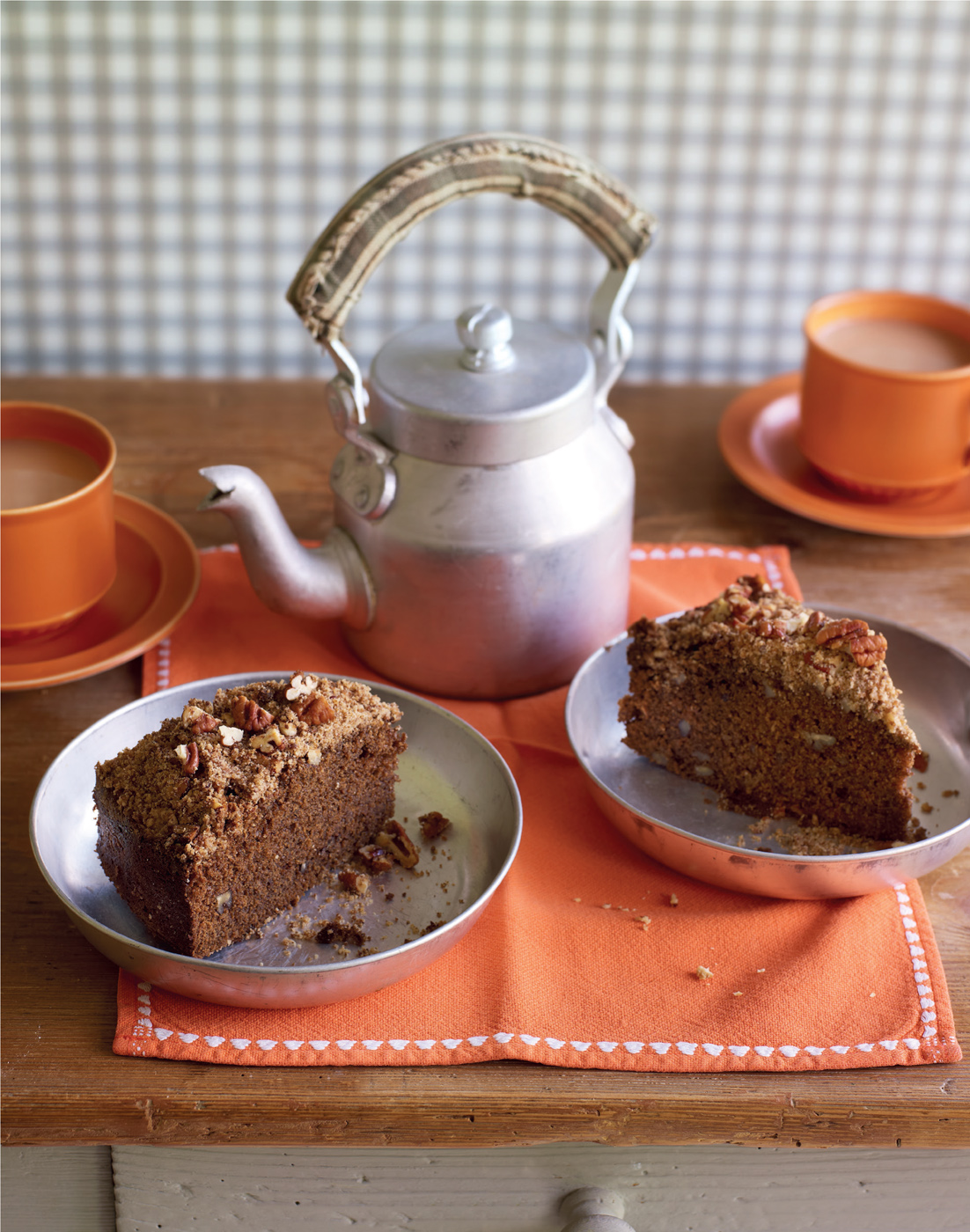 A moist, spiced sponge, rich with molasses and brown sugar and topped with a lovely coconut and pecan crust. Be careful when finishing the crust under the hot grill – you want it bubbly and brown, but not burnt to a crisp!