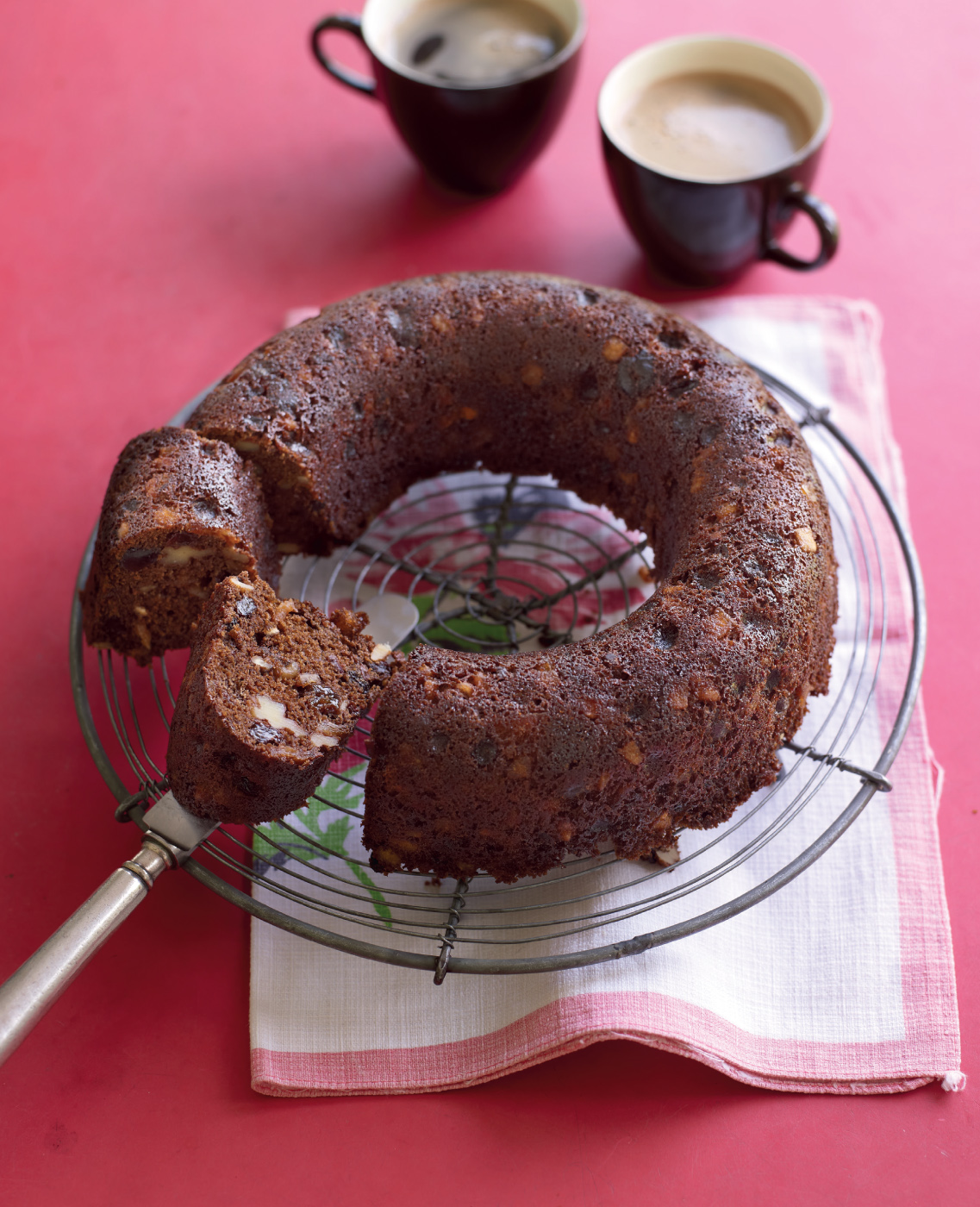 6. Scrape the batter into the prepared ring mould or loaf tins and bake for 1 hour 30 minutes–1 hour 50 minutes, until a skewer inserted into the cake comes out clean. Cool the cake in the tin, then skewer little holes on top and pour in the remaining port. You can also sprinkle with more dark rum if desired. Turn out the cake once the extra liquid has soaked in and cool completely.