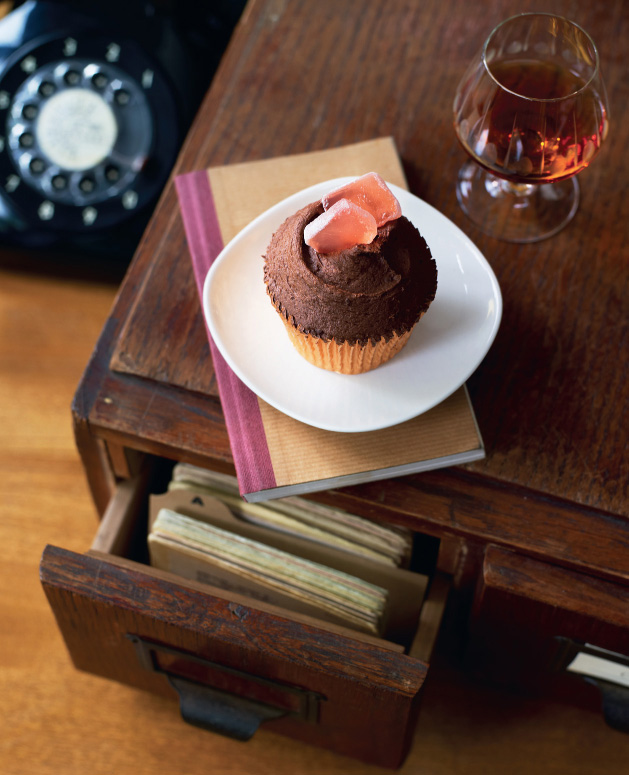 11. Once the cupcakes are cool, use a sharp knife to make a hollow in the centre of each cupcake, approximately 2cm (¾in) in diameter and about 3cm (1¼in) deep. Retain the cut-out piece of sponge. Spoon about 1–2 teaspoons of the rose custard into each hollow.