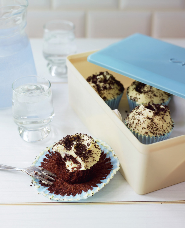 15. Spoon generous amounts of the frosting onto each cupcake, then gently smooth over with a palette knife, making a swirl at the top if you wish. Top each cupcake with a mini custard cream sandwich cookie.