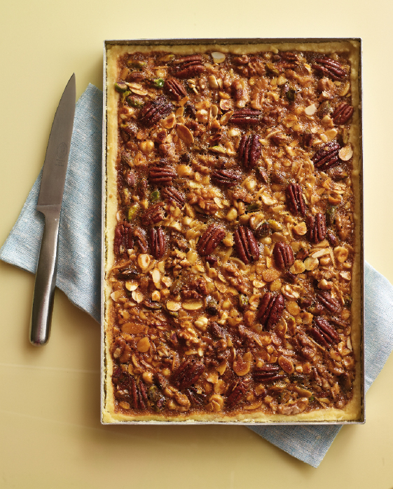 6. Mix all the nuts together in a separate bowl, and scatter them over the part-cooked pastry base. Carefully pour the syrup and egg mixture over the nuts, making sure it is evenly spread over the base.