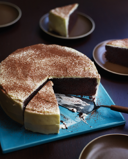6. Place the cooled cake on to a plate or cake card and top generously with the cream cheese frosting. The cake can be decorated with a light dusting of cocoa powder.