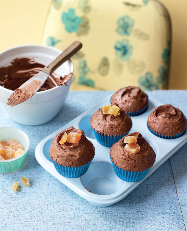 8. When the cupcakes are cool, spoon a generous amount of the frosting onto each cupcake, then gently smooth over with a palette knife, making a swirl at the top if you wish. Top each cupcake with a couple of pieces of crystallised ginger.