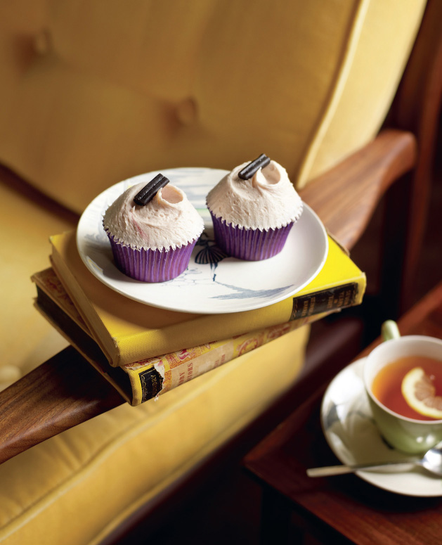 11. Spoon generous amounts of the frosting onto each cupcake, then gently smooth over with a palette knife, making a swirl at the top if you wish. Top each cupcake with a liquorice sweet.