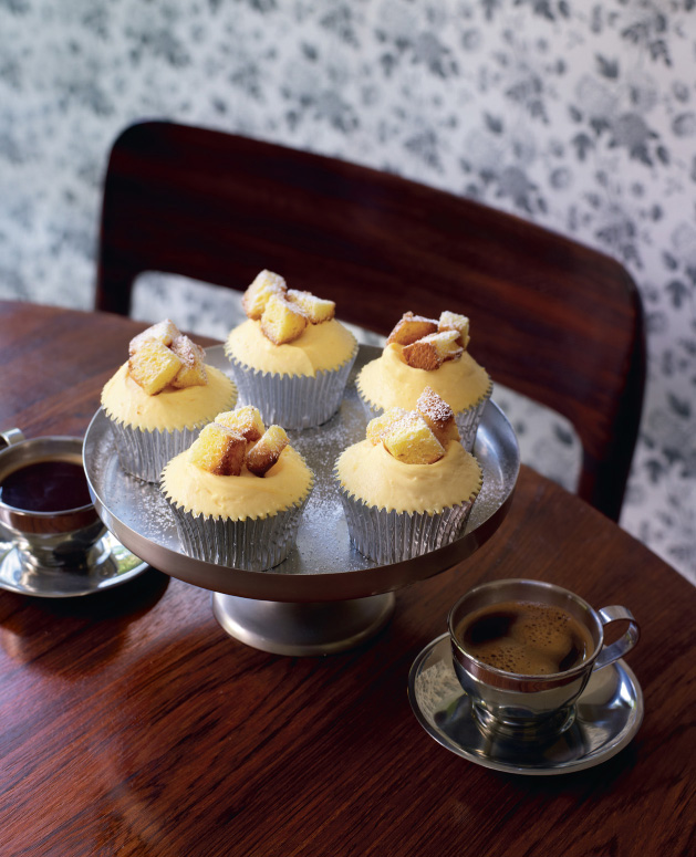12. Spoon generous amounts of the custard onto each cupcake, then gently smooth over with a palette knife, making a swirl at the top if you wish. Top each cupcake with 2–3 pieces of toasted panettone and lightly dust with icing sugar.