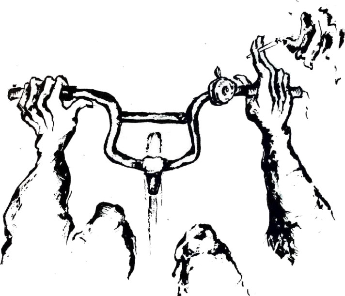 Подъехал к лавочке. У неё разбросаны бутылки, одна из них, по-видимому, с какой-то настойкой, стоит почти наполовину полная. Мужчина останавливается, снимает рюкзак, достаёт из него полторашку дешёвого пива, начинает пить. Сегодня он в хорошем расположении духа. Вальяжно развалившись на лавке, он продолжает пить, иногда оглядываясь по сторонам, желая найти подходящего слушателя, чтобы излить незнакомцу душу, разделив с ним своё беззаботное время и две полторашки пива (ещё одна осталась припрятана в рюкзаке). Он снова закуривает и вот наконец замечает подходящего слушателя.