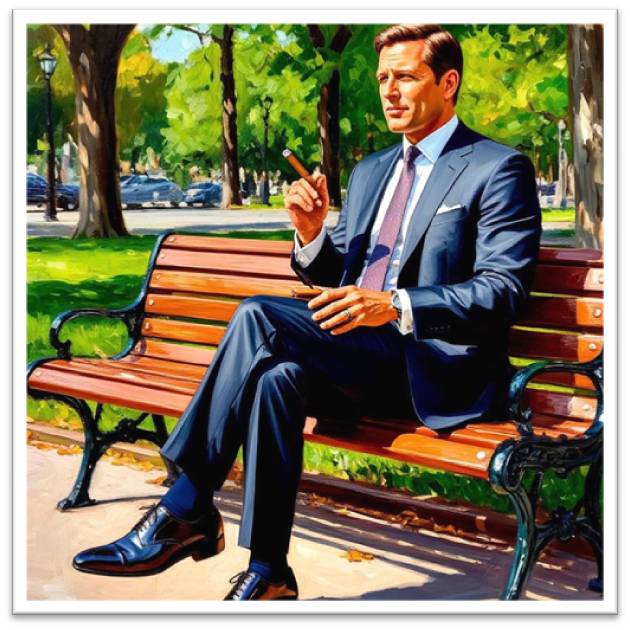 Suddenly, a figure of impressive authority settled onto the bench beside him. This was a man who screamed success; his pinstripe suit practically bellowed “I mean business!” Even the lapels of his jacket seemed to stand to attention, radiating competence and a no-nonsense attitude. This was a man, Jack thought, who knew his way around a balance sheet and wouldn't flinch if you offered him a handful of nettles.