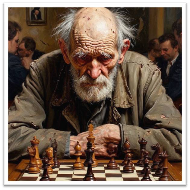 The Chess Club, for Jack, wasn't about the chess. Oh no. He couldn't tell a rook from a rambler rose. It was the spectacle, the human drama, the sight of men contorting their faces into expressions of profound, yet ultimately pointless, concentration that truly tickled his fancy. Inside, the air hung thick with the odour of stale pipe tobacco and desperation, a blend as potent as a magician's potion. He spotted him then: the Old Man with the Trembles. His hands shook like leaves in a hurricane and his eyes darted about like frightened sparrows. His chess game was, to put it mildly, a disaster. Even Jack, whose strategic prowess peaked at remembering which end of a spoon to use, could see the man was playing with the skill of a badger attempting brain surgery.