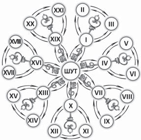 Сердцевиной этого цветка, или осью колеса, нами был «назначен» Аркан Шута. Это ключевая карта колоды, вокруг которой и происходит круговерть событий.