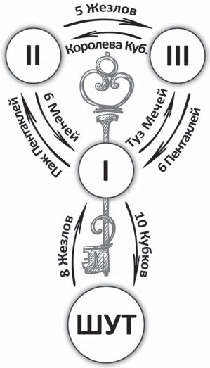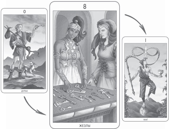 От Шута путь к Магу пролегает через Восьмерку Жезлов, где подбирается правильный Ключ.