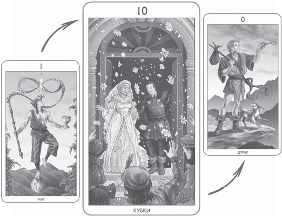 Маг возвращается к точке Шута по Десятке Кубков под одобрение и восторги окружающих.