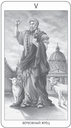Верховный Жрец, в отличие от Императора, является проводником Высшей Воли. Ему не требуется оправдывать законы мирозданья, ему достаточно их объявить, и они будут единственно правильными. Более того то, что для Императора было единичным случаем вынужденных решений, под авторитетом Жреца становится общим правилом. Верховный Жрец получает дополнительные возможности по сравнению с IV Арканом, что и символизирует нарисованный Ключ.