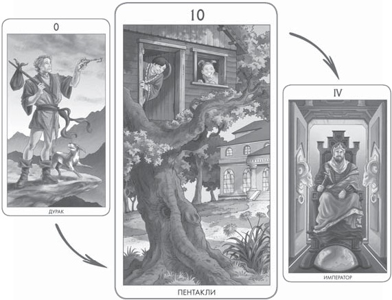 Десятка Пентаклей помогает пройти путь от Шута к Императору, когда в игровой форме приобретаются начальные навыки, накапливается опыт того обустройства дома и мира, которые в дальнейшем и составят основные качества Императора.