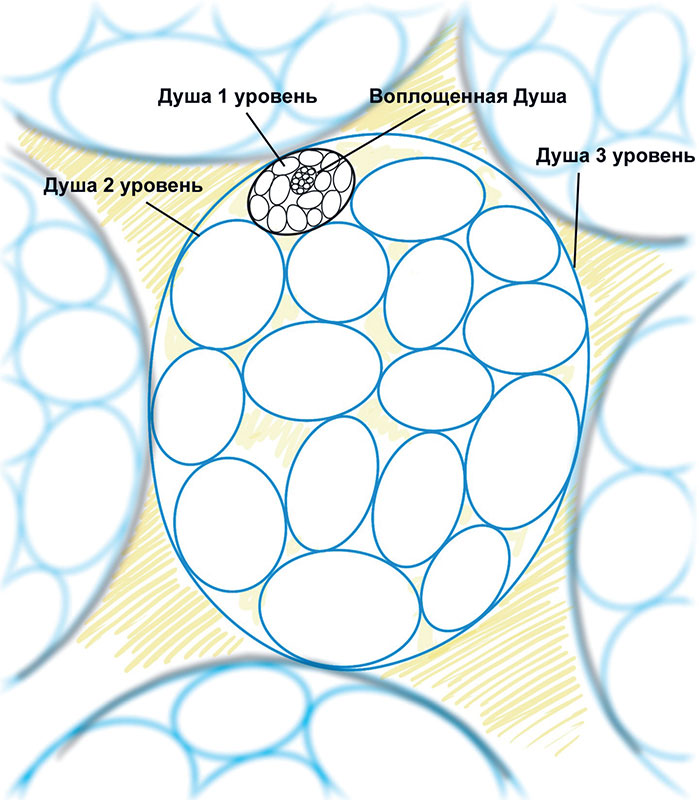 Включенность Душ меньших иерархий в Родительские Души на этой схеме не отражена, так как она двухмерна.