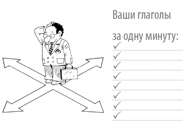 Инструкция предельно проста: за 1 минуту (очень важно поставить ограничение во времени, иначе эксперимент не удастся) напишите максимальное количество глаголов, которые можно считать вашими лозунгами, девизами. Сделайте это, даже если вы никогда в своей жизни не задумывались о том, если ли у вас свой персональный девиз. Обычно после пятого глагола наступают затруднения, но их надо постараться преодолеть, потому что в вашем списке глаголов должно быть не меньше семи.