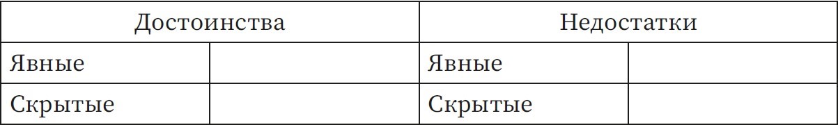 Можно нарисовать таблицу со своими критериями или для дегустации этого метода воспользоваться готовым шаблоном ниже, добавляя при необходимости свои пункты.