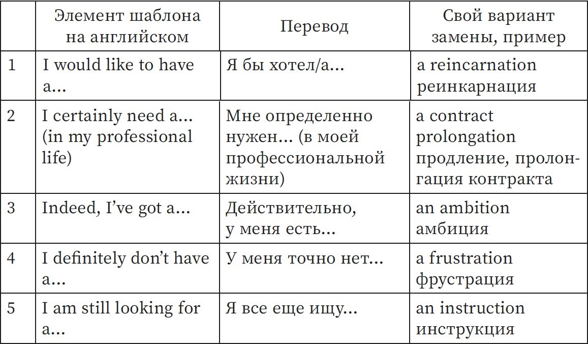 Шаг 5. Игра в паттерны (тренируем творческое применение)На всех вышеупомянутых ресурсах выберите десять слов, которые точно пригодятся в жизни. Составьте с ними предложения, используя в качестве основы паттерны (шаблоны) ниже. Чем ярче и интереснее предложения, тем лучше. Слова запомнятся надолго!