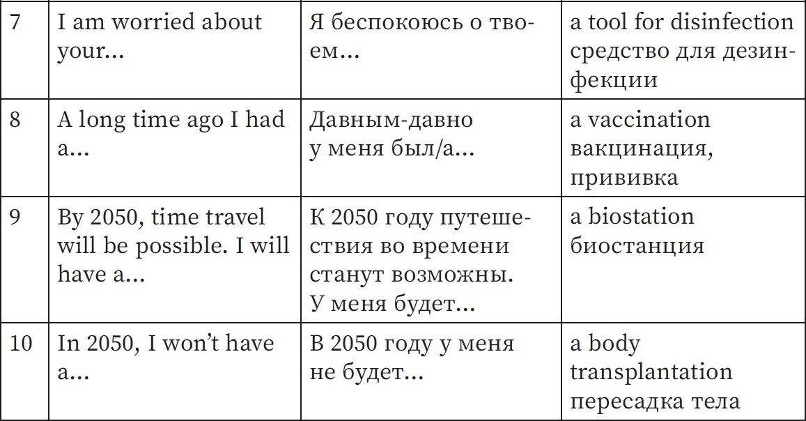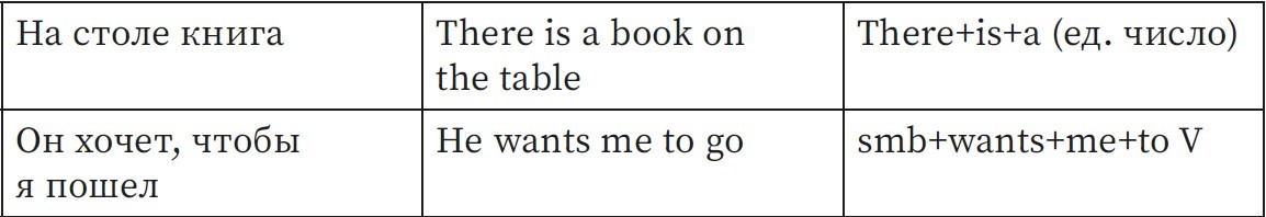 Первая колонка: предложение на русском языке. Вторая: перевод этой фразы на английский и, собственно, паттерн для тренировки. Третья: грамматический комментарий, чтобы избежать типичных ошибок использования или перевода.